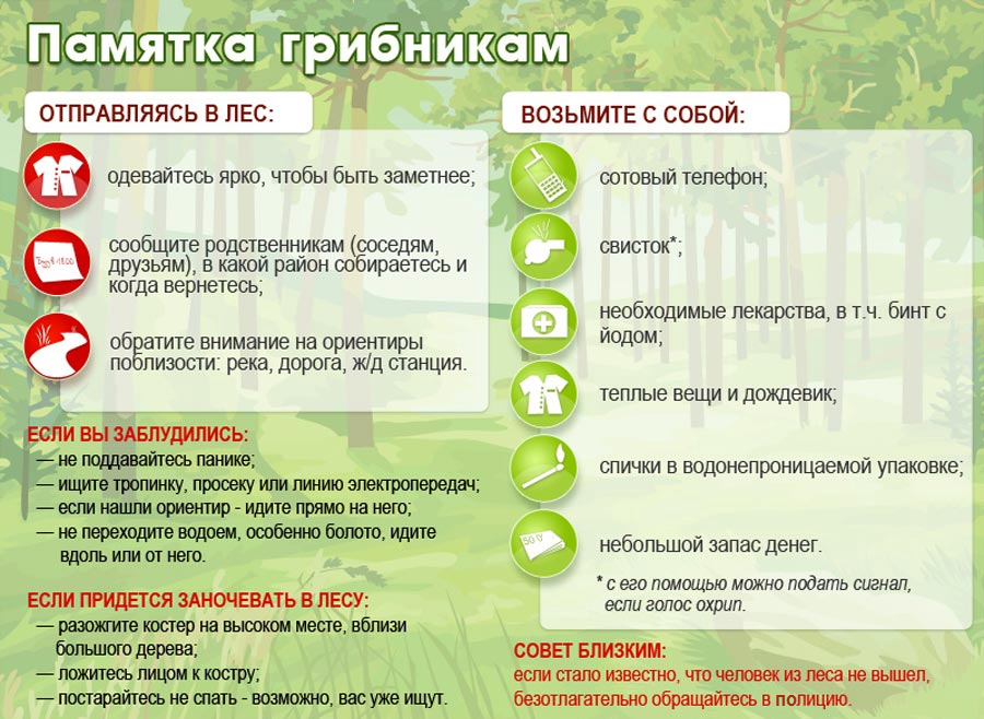 При отправлении в лес каждый грибник должен взять с собой необходимые лекарства, включая бинт с йодом, набор спичек в водонепроницаемой упаковке, дождевик, небольшой запас денег. Одежду для похода в лес выбирайте ярких тонов. Камуфляжная форма, старые куртки, которые грибники надевают для похода в лес, усложняют поиски. Также очень важно брать с собой в поход больше еды, теплых вещей, нож, компас и удобную обувь.