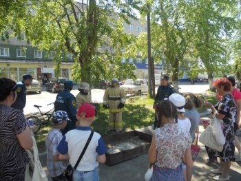 Главное – это техника безопасности, каждый, кто хотел попробовать себя в роли пожарного одевал полный комплект боевой одежды: брюки, куртку, каску с подкасником, рукавицы-краги и шел тушить условный очаг пожара при помощи негорючего полотна, конечно под чутким контролем пожарных. Перед тем как приступить к тушению "Юному пожарному" объясняли, что горение прекращается без доступа кислорода, а так же чем еще из подручных средств можно воспользоваться для такого вида тушения.