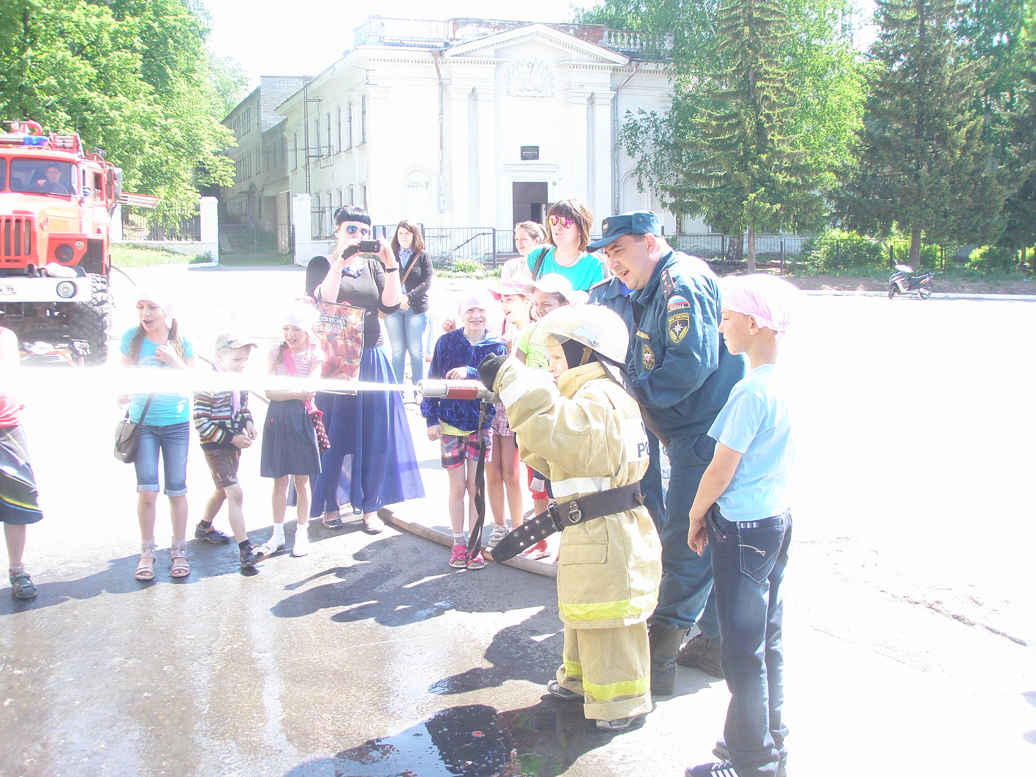 По окончании концерта все отряды пересчитали "смайлики", которые они заработали в ходе викторины "Искорка", победители, набравшие 14 наклеек, получили сладкий приз – конфеты от ВДПО, а так же попробовали себя в роли пожарных, они надевали боевую одежду и работали со стволом подавая воду от пожарного автомобиля по импровизированной мишени.