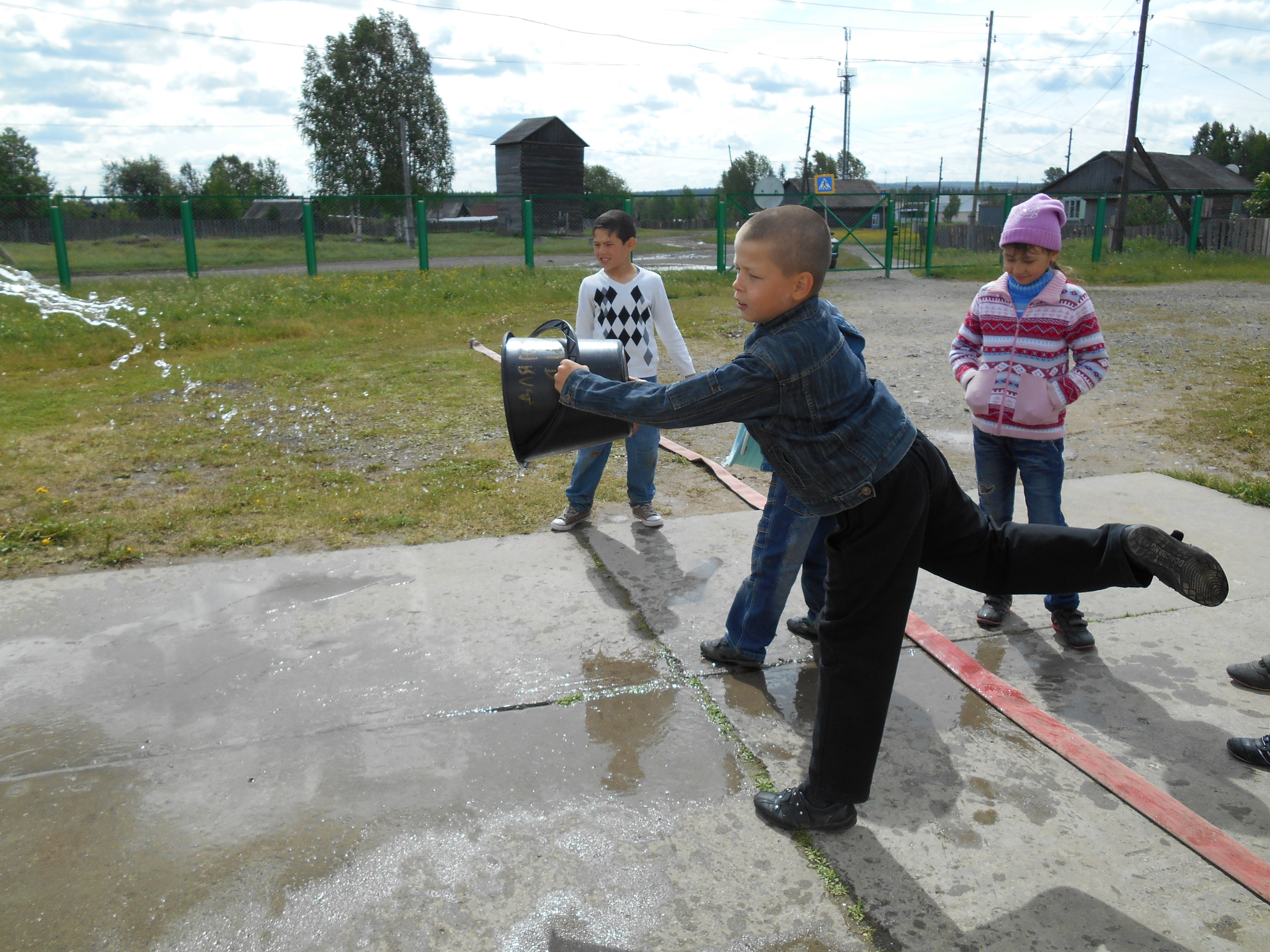 Следующий этап праздника назывался "ведро". Плеснуть водой из ведра на условный пожар простое действие, на практике получилось не у всех ребятишек и здесь взрослые не утерпели, и принялись обучать своих сорванцов.