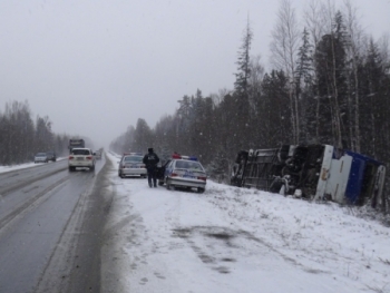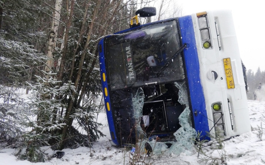 25.03.2015 года в 15:10 на 212 км автодороги "Екатеринбург – Серов" 45-летний водитель автобуса "САНГ ЯНГ ТРАНСТАР" с 25-летним стажем, неверно выбрал скорость движения в условиях снегопада, не справился с управлением и допустил съезд с проезжей части дороги в кювет с последующим опрокидыванием.