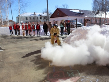 Все участники встречи вышли на улицу, Тимофей Ведерников, командир ДЮП, надев боевую одежду пожарного, еще раз повторяет для зрителей порядок использования огнетушителя: