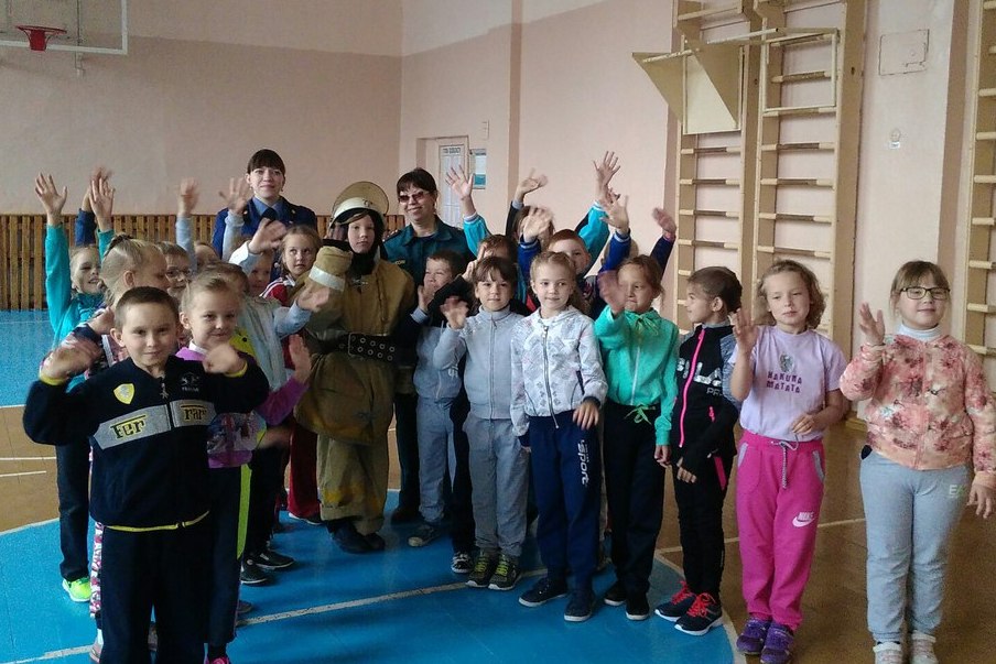 После слов приветствий дети разделились на две команды "Пламя" и "Огнетушитель" и на время прошли увлекательную эстафету, которая началась с гладкого бега, где эстафетной палочкой был настоящий пожарный ствол. Далее теория – вопрос "Признаки отравления угарным газом?". Второклассники этого еще не проходили, но быстро сориентировались и назвали основные симптомы головокружение, тошнота, звон в ушах, потеря сознания. Далее ребята выносили условно пострадавшего из задымленного помещения. Мальчики сцепляли руки замочком и бегом несли девочек на следующий этап где один из участников надевал боевую одежду пожарного так же быстро как настоящий боец! И последний этап – эвакуация ребята по очереди поднимались и спускались по шведской стенке, проходили по гимнастической скамейке и прыгали через "аварийный выход", который изображал обруч.