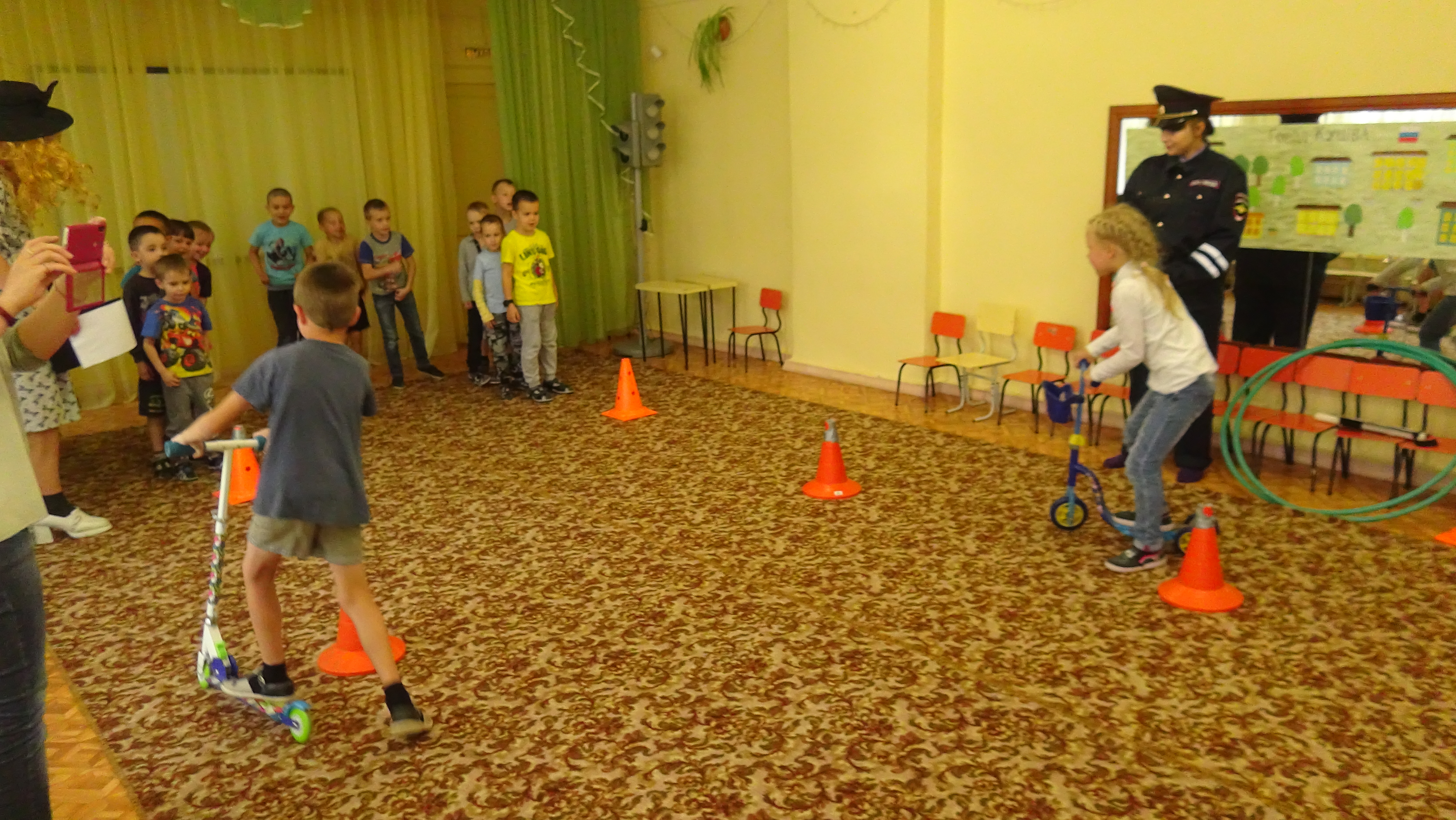 В гостях у ребят были бабка-Авария (Собенин Павел) и инспектор ГИБДД (Елкина Ксения), которыми были проведены следующие конкурсы: