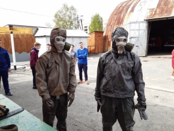 Другая группа мальчишек на время надевали общевойсковые защитные костюмы!