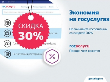 Напоминаем, что с 1 января 2017 года лицам, обращающимся за госуслугой с помощью сайта www.gosuslugi.ru, предоставляется 30%-ая скидка на уплату госпошлины. И эта льгота распространяется на все виды государственных услуг, где предусмотрена оплата госпошлины.