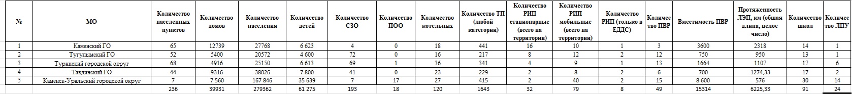 1.2. Общие данные: наибольший риск возникновения ЧС вследствие воздействия неблагоприятных метеорологических явлений прогнозируется на территории 5-ти муниципальных образований: «Тавдинский ГО, Туринский ГО, Тугулымский ГО, Каменский ГО, ГО г. Каменск-Уральский», но также существует риск воздействия неблагоприятных метеорологических явлений на территориях всех муниципальных образований (73 МО) Свердловской области (рекомендуется всем 100 % МО проводить превентивные мероприятия):