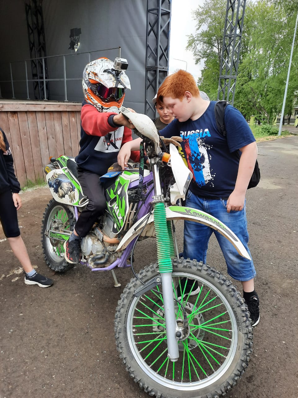 Владимир Сорокин, Антон Ларьков и Михаил Петреня, продемонстрировали школьникам три разновидности мототранспорта – это скоростные мотоциклы, тяжелые и кроссовые, рассказали, чем они отличаются друг от друга. Владимир Сорокин рассказал про тонкости защитной экипировки для каждого вида мотоциклов, показал какие бывают мотошлемы, для чего необходимо использовать экипировку и особенностях, при управлении подобной техникой.