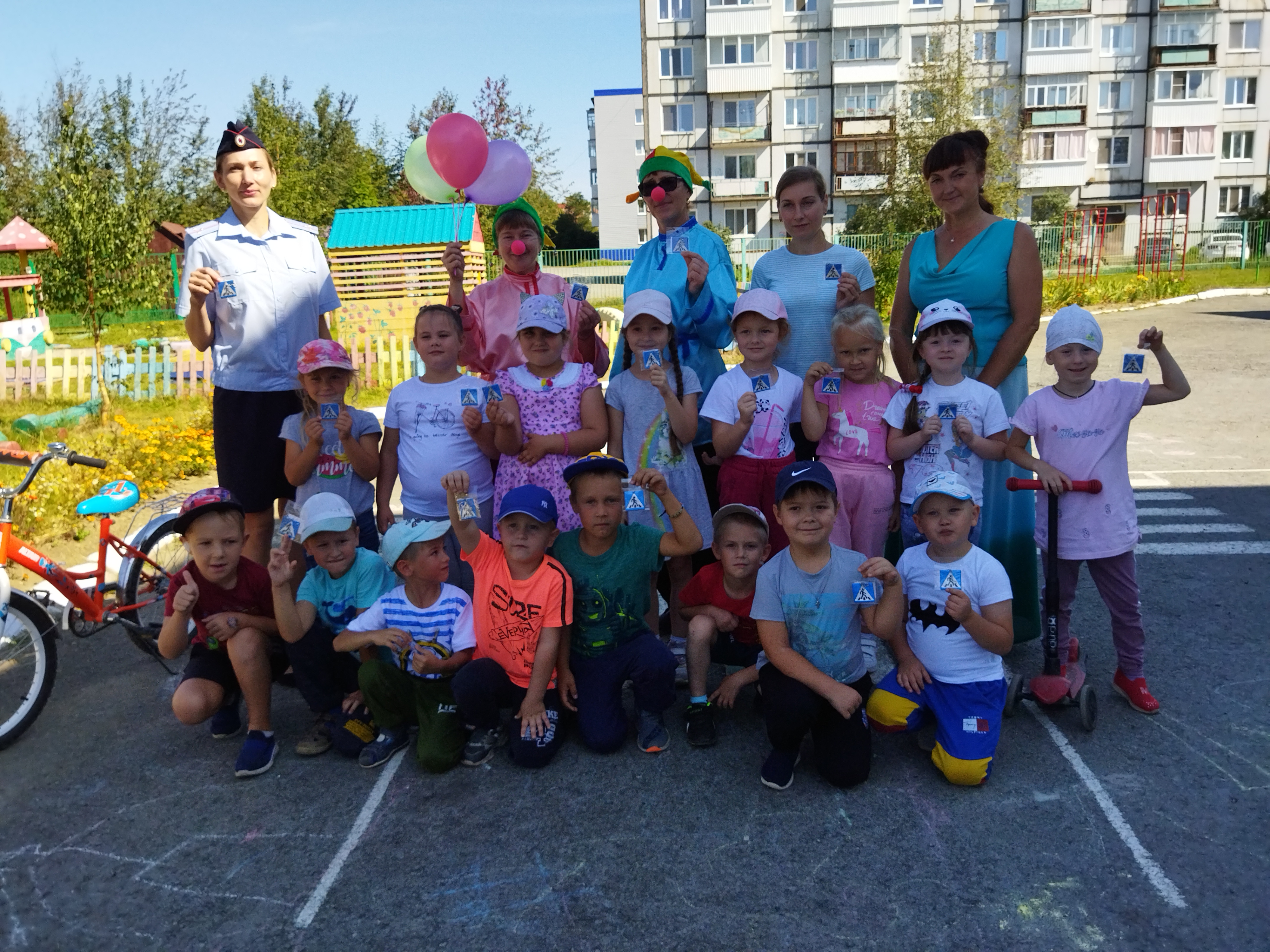 Лето и любимое развлечение детворы – это катание на велосипеде или самокате. Однако не все знают правила езды на этих транспортных средствах, как, впрочем, и наши герои развлечения клоуны Петрушка и Кирюшка. Ребята рассказали, какие правила необходимо соблюдать, читали стихи о правилах езды на велосипеде и самокате, о световозвращающих элементах, а также приняли участие в викторине по ПДД «Грамотный велосипедист» и отгадали загадки про пешеходный переход, светофор и дорожные знаки. После дружной разминки начались спортивные соревнования на самокатах. Ребятам нужно было проехать четыре станции: «кто быстрей», «змейка», «привет друг», «поделись самокатом».