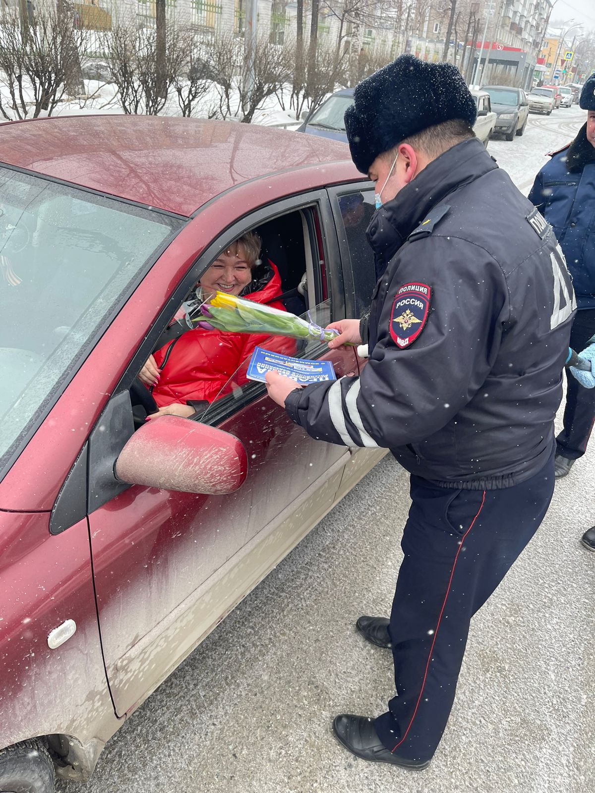 В преддверии весеннего праздника Международного женского Дня, сотрудники Госавтоинспекции города Кушва провели, ставшую уже традиционной, акцию «Цветы для автоледи». Слова поздравления, полезные подарки и конечно цветы были вручены прекрасному полу начальником ГИБДД города Кушва Николаем Вохмяниным и заместителем командира отдельного взвода ДПС Антоном Михалевым.