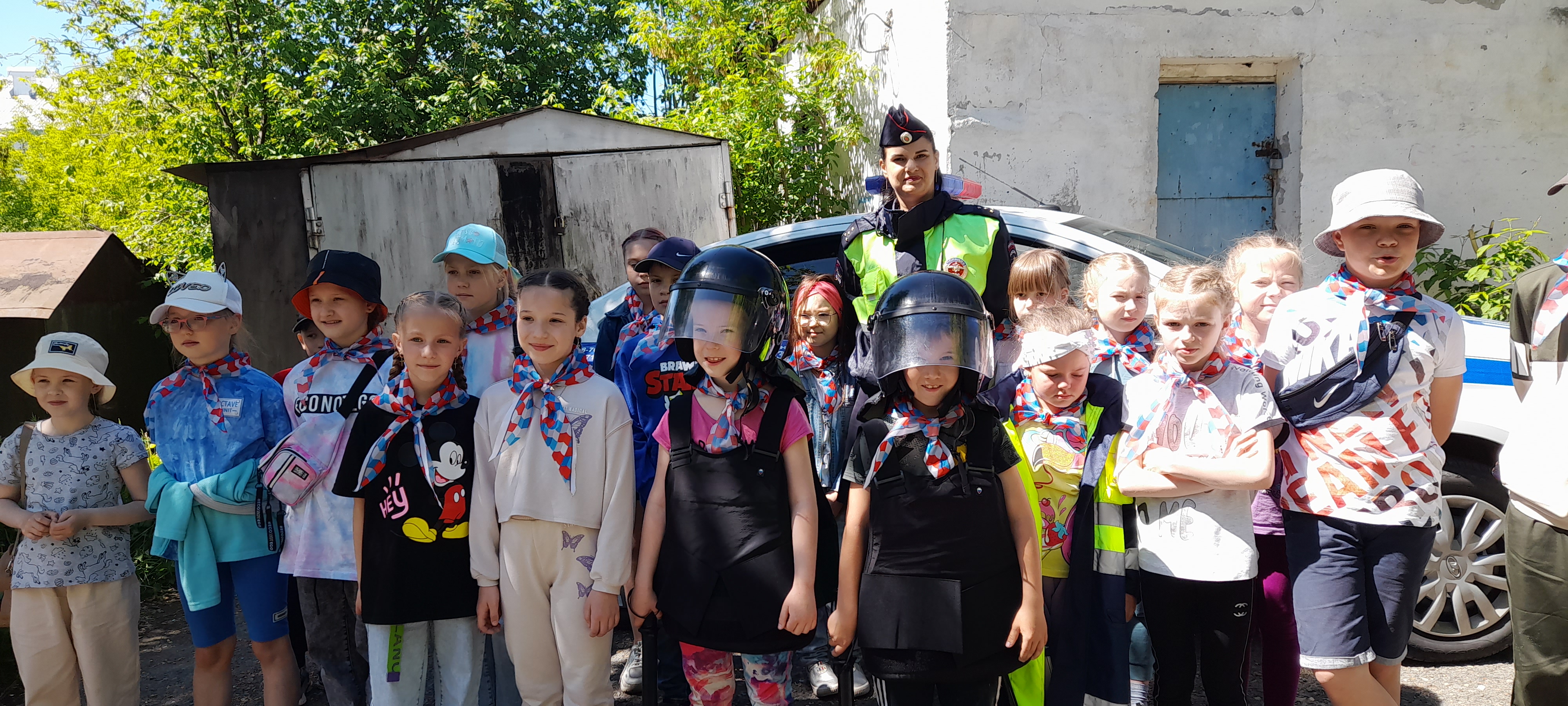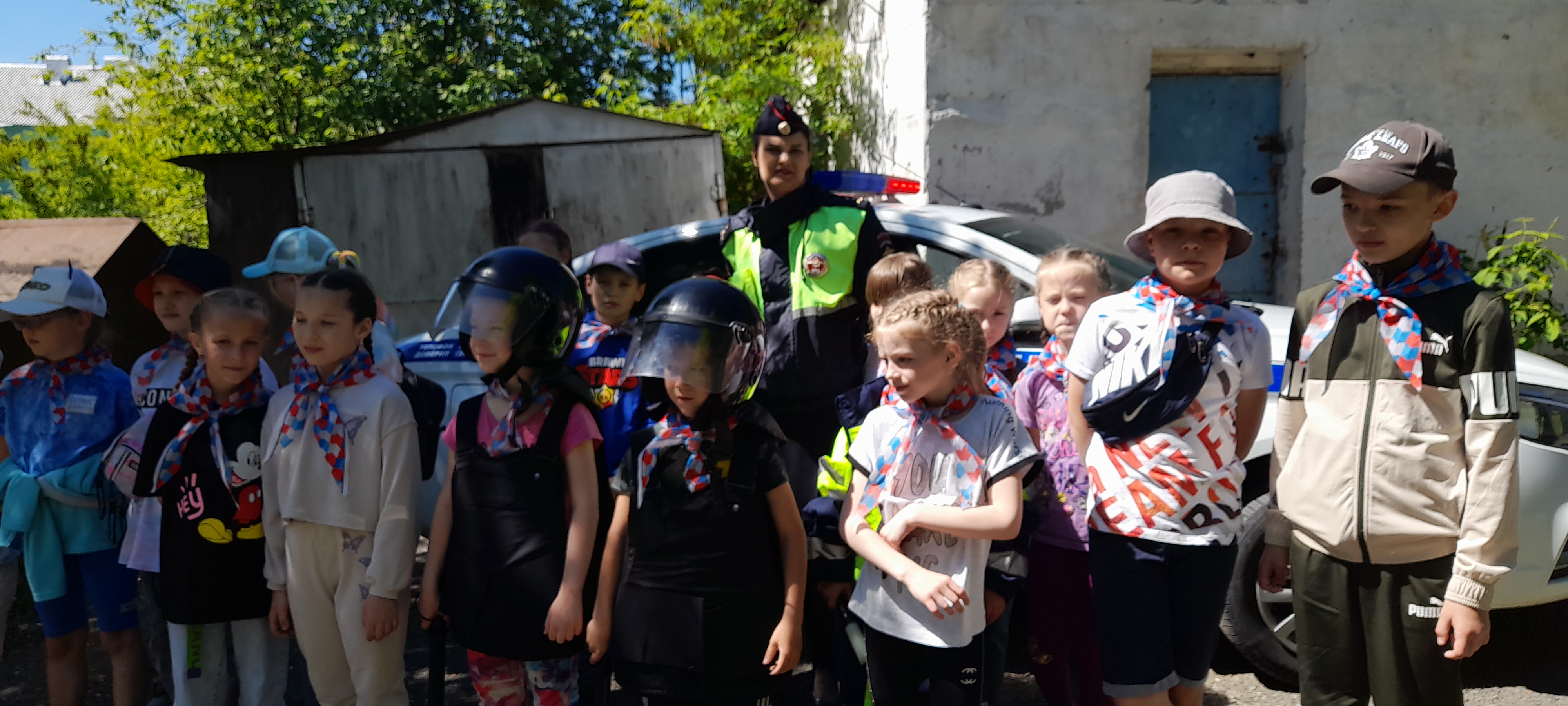 Госавтоинспекторы знакомят детей с патрульной машиной.