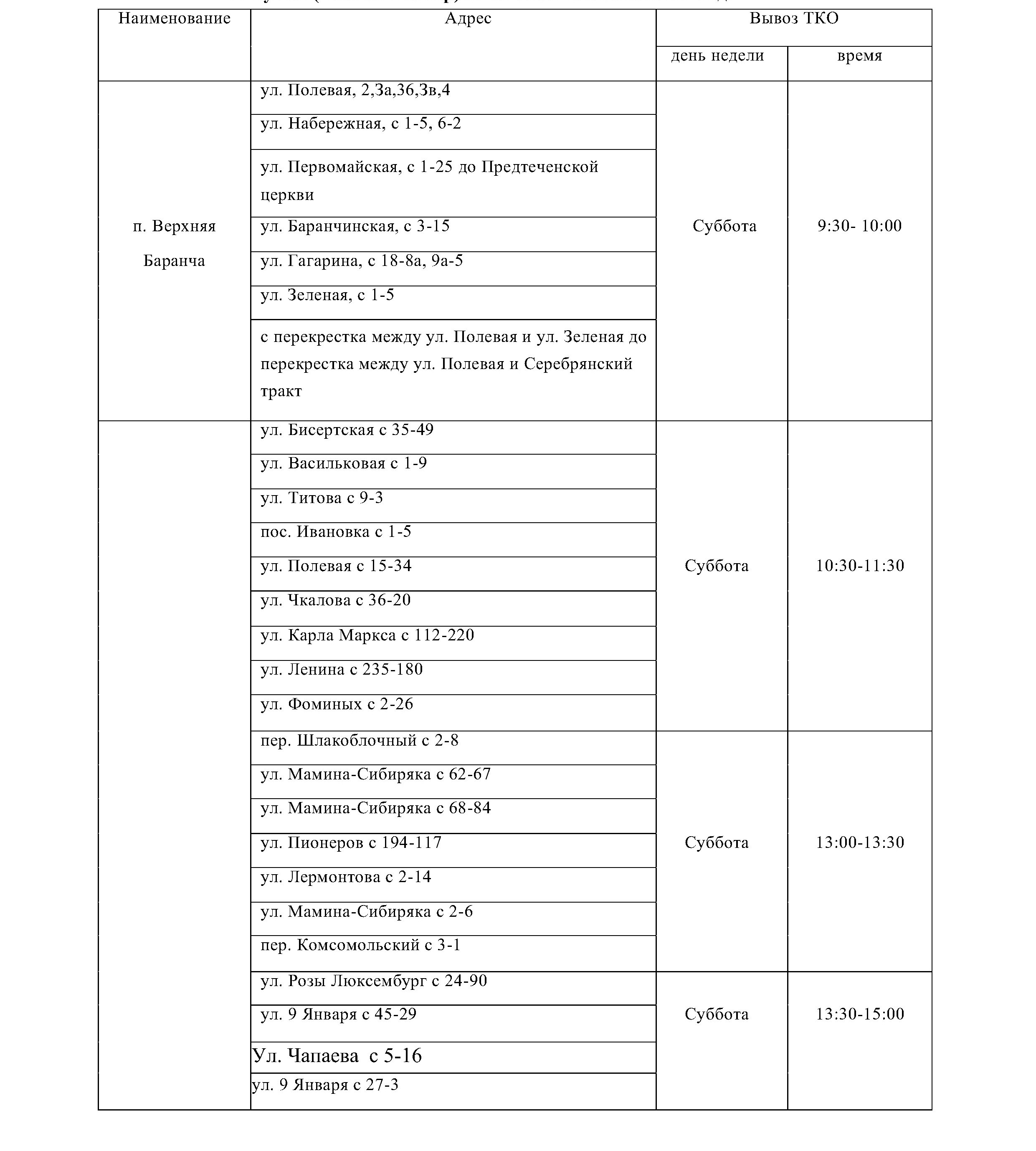 Обращаем Ваше внимание, что в соответствии с разъяснениями Минприроды РФ от 11.10.2019 г. услуга по обращению с твердыми коммунальными отходами (ТКО) не распространяется на сбор и вывоз строительного мусора, веток, спила деревьев, травы, ртутных ламп, автомобильных шин, разобранных строений, плёнки и стекло от теплиц. При помешочном сборе потребитель к указанному в графике времени и адресу складирует тару с отходами (пакеты, мешки) у края проезжей части дороги. Подборщик самостоятельно производит погрузку отходов в мусоровоз. График вывоза носит тестовый характер, в случае изменений, граждане будут дополнительно оповещены через сайт Регионального оператора http://rif.ecotko.ru/, а также через сайт администрации городского округа. Допускается отклонение от графика движения по времени в следующих случаях: