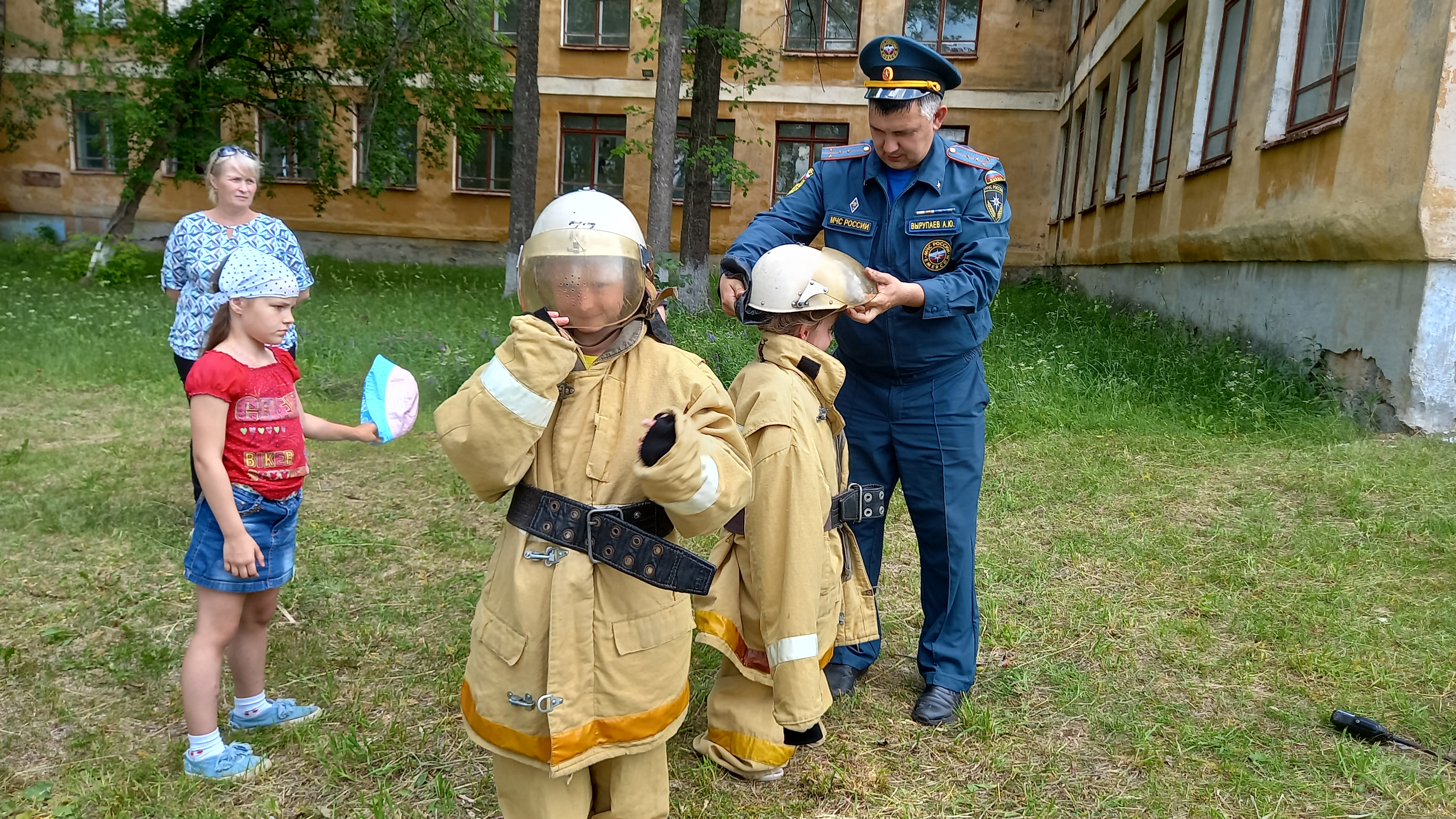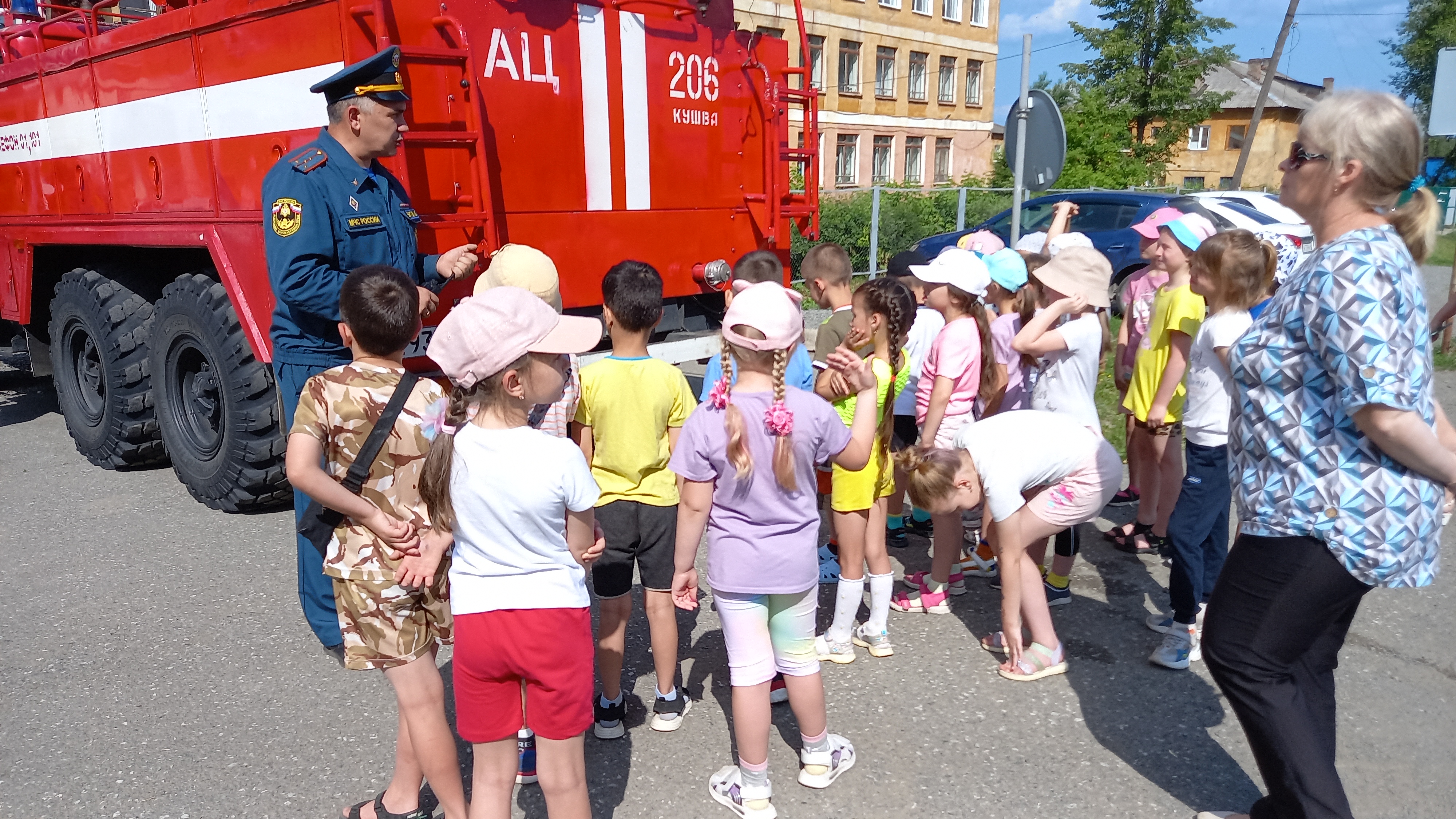 День в летнем лагере школы №10 г. Кушва для ребятишек начался с веселой зарядки, а после завтрака к ним прибыли гости из МЧС – дежурный караул 206 пожарно-спасательной части во главе с начальником караула Александром Вырупаевым и дознаватель отдела надзорной деятельности и профилактической работы Юлия Христофи.