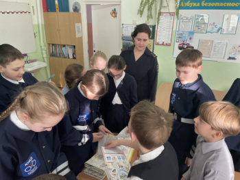 В этот же день педагог - организатор МАУ ДО ДДТ г. Кушва Третьякова Ю.Б. и инспектор ГИБДД Леоненко О.В. совместно с представителями отряда ЮИД проверили знания у детей начальной школы по правилам дорожного движения, задавали им вопросы-ситуации, разыгрывали с ребятами различные варианты безопасного поведения в дорожной среде.