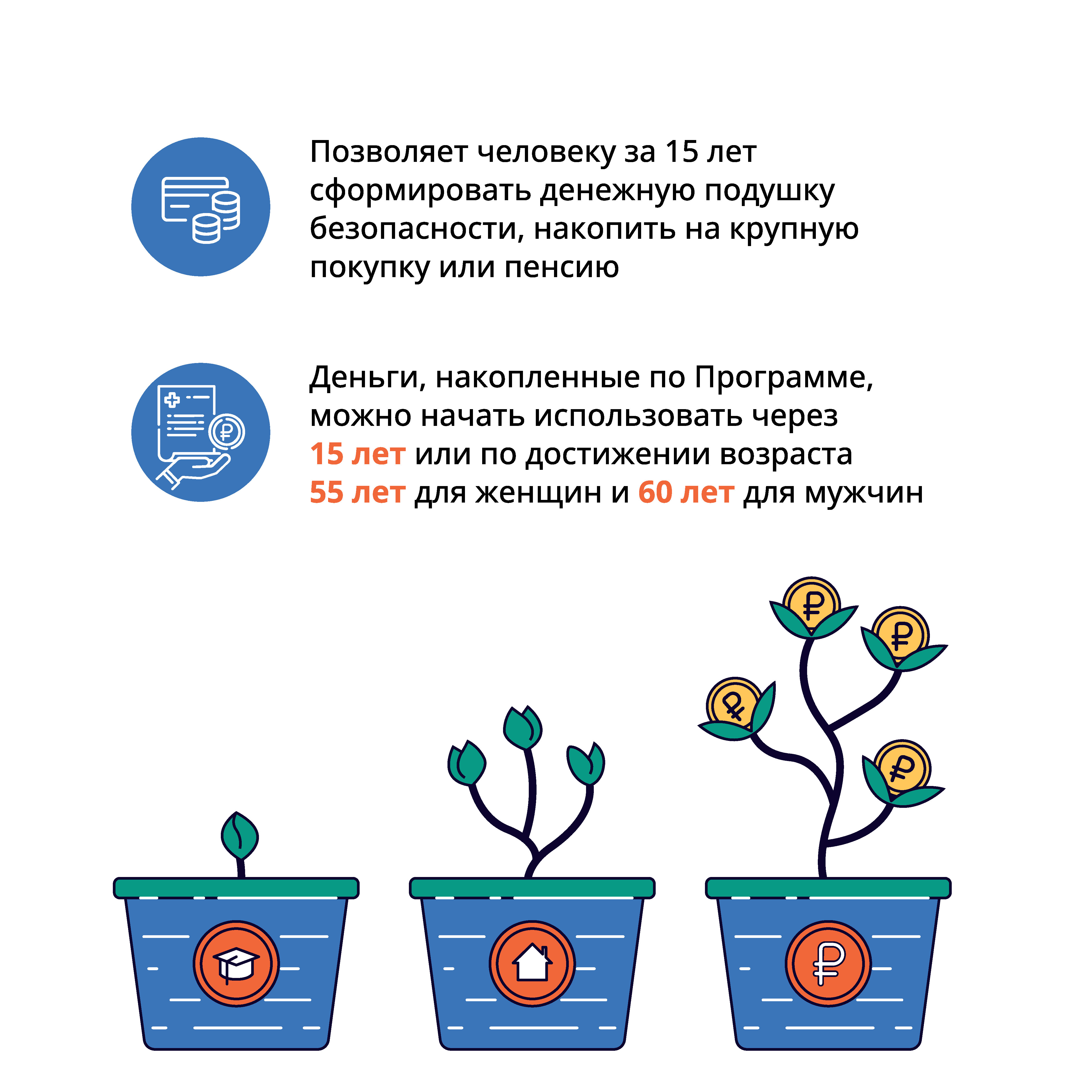 Сбережения могут быть использованы как дополнительный доход после 15 лет участия в программе или при достижении возраста 55 лет для женщин и 60 лет для