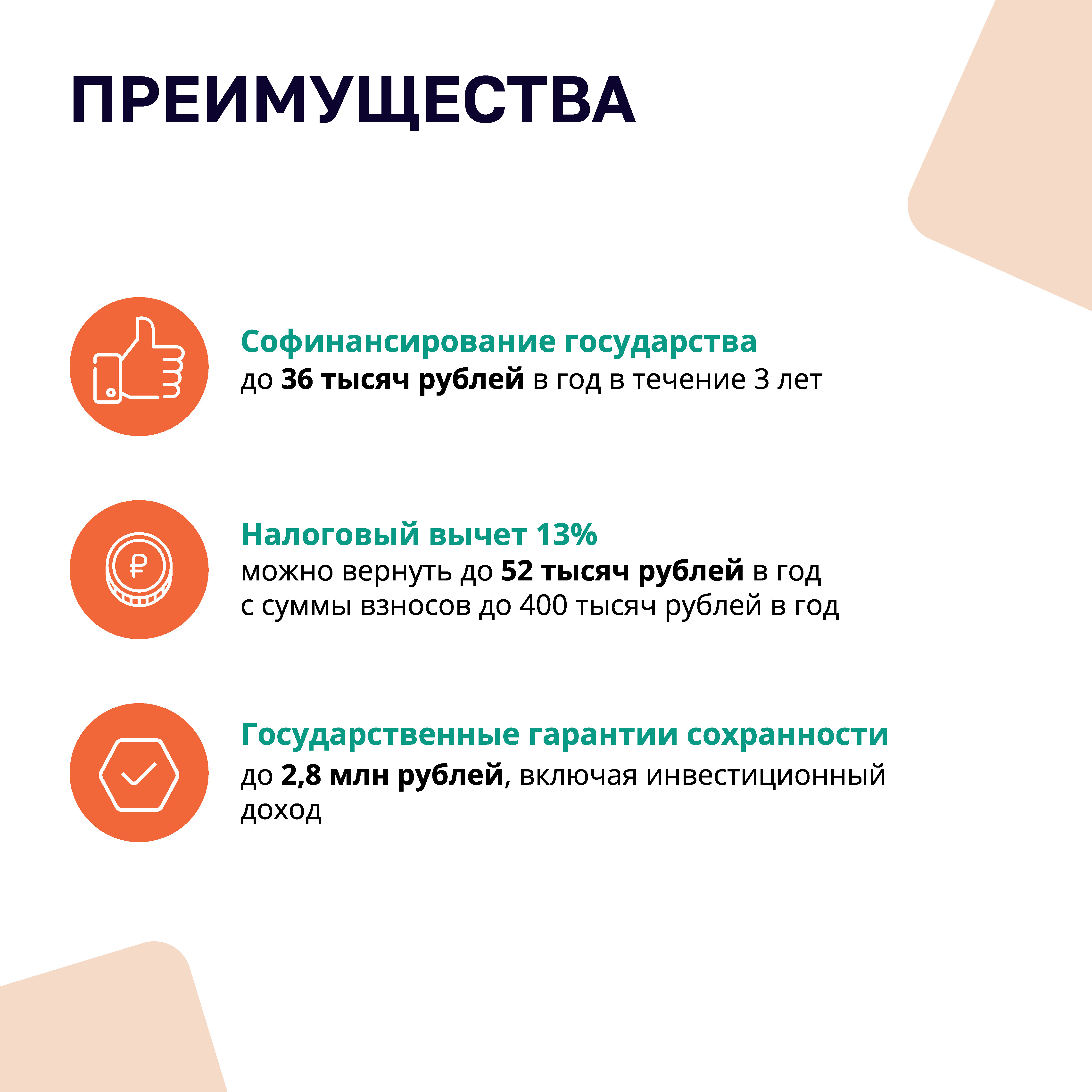 Новый механизм предусматривает различные стимулирующие меры для участников программы, в том числе дополнительное софинансирование со стороны государства до 36 тысяч рублей в год. Кроме того, участники системы смогут оформить ежегодный налоговый вычет до 52 тысяч рублей при уплате взносов до 400 тысяч рублей в год.