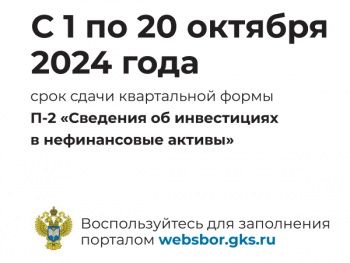 С 1 по 20 июля 2024 года необходимо направить квартальную форму федерального статистического наблюдения № П-2 «Сведения об инвестициях в нефинансовые активы» через портал http://websbor.gks.ru.