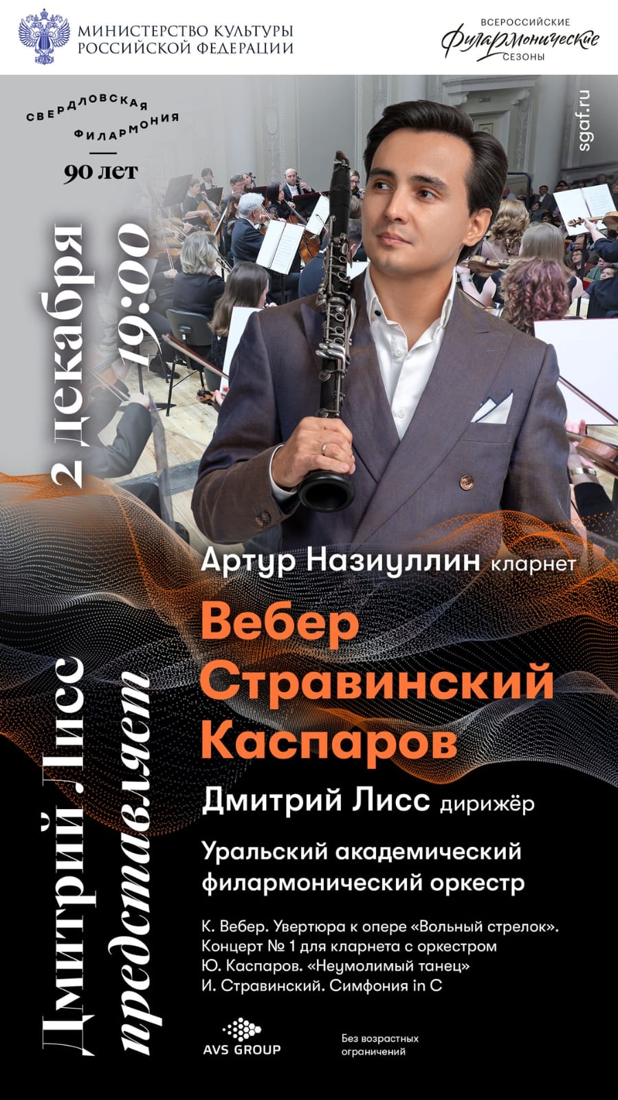 Представьте идеальный концерт: на сцене — исполнители-виртуозы, признанный дирижёр, блестящий солист, в зале — слушатели, влюблённые в музыку. В этот вечер Уральский академический симфонический оркестр под руководством Народного артиста России Дмитрия Лисса представит публике настоящие жемчужины: увертюру первой романтической оперы; симфонию-дебют Стравинского в США, соединяющую классику с дерзостью ХХ века; авангардный фейерверк Каспарова. Солирует кларнетист Артур Назиуллин, Народный артист Башкирии и добрый друг филармонии. Для совершенства осталось немного — ваша радость, дорогие друзья!