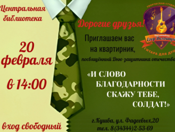 Центральная библиотека приглашает 20 февраля 2026г. в 14:00. отпраздновать День защитника Отечества в теплой дружеской атмосфере. Квартирник «И слово благодарности скажу тебе, солдат» с творческим коллективом «Гитара для души» под руководством Егора Долгинцева. Поем под гитару любимые песни, наполненные тёплыми воспоминаниями о героизме и мужестве наших соотечественников.