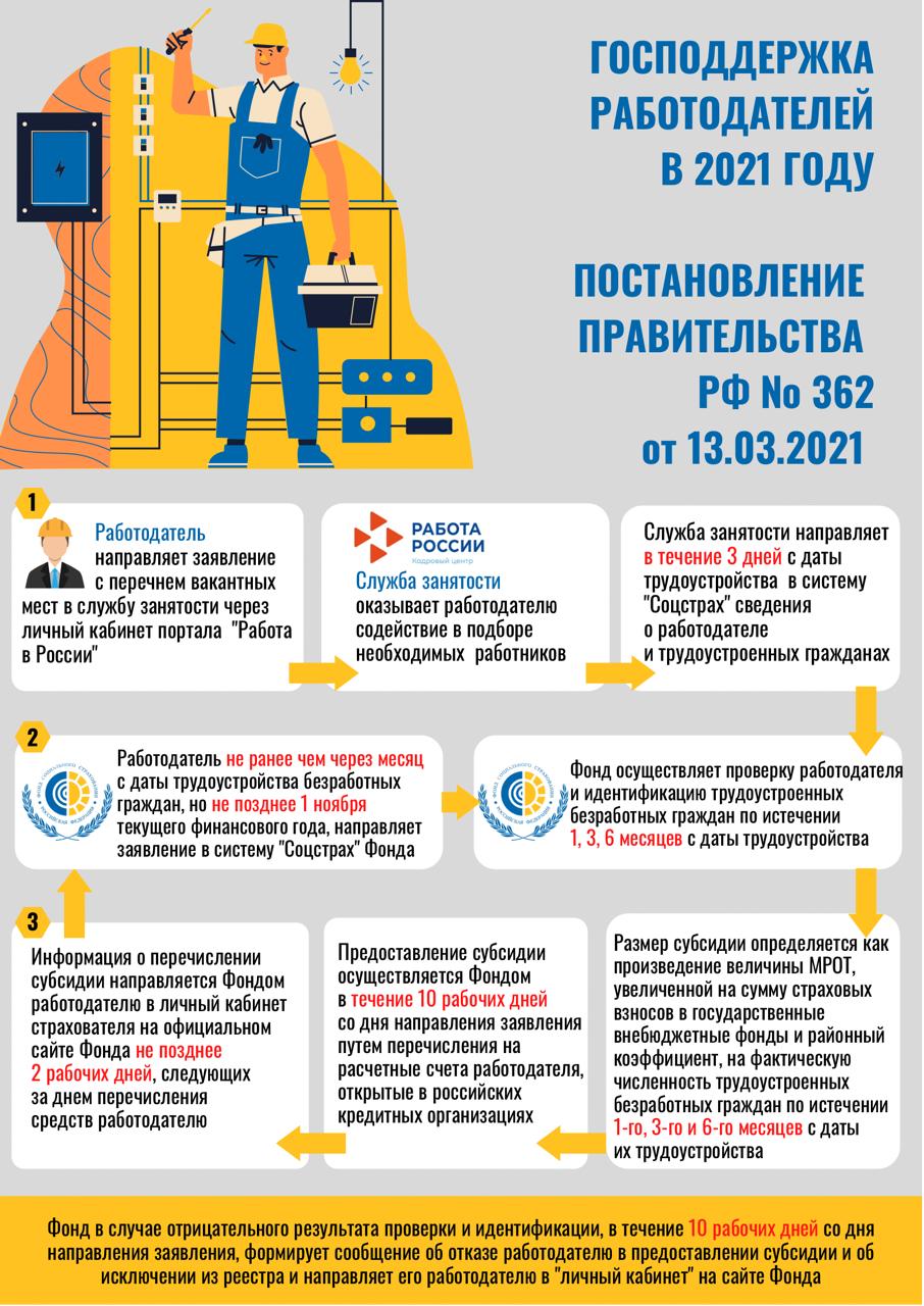 Постановление Правительства Российской Федерации от 13 марта 2021 г. № 362 "О государственной поддержке в 2021 году юридических лиц и индивидуальных предпринимателей при трудоустройстве безработных граждан" Скачать