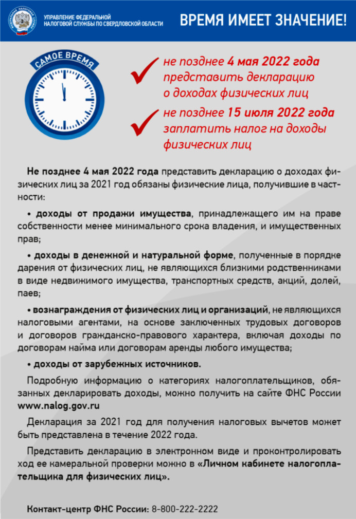 Администрация Кушвинского городского округа во взаимодействии с Межрайонной инспекцией Федеральной налоговой службы № 27 по Свердловской области информирует о том, что не позднее 4 мая 2022 года обязаны представить декларацию о доходах за 2021 год физические лица, получившие в частности: