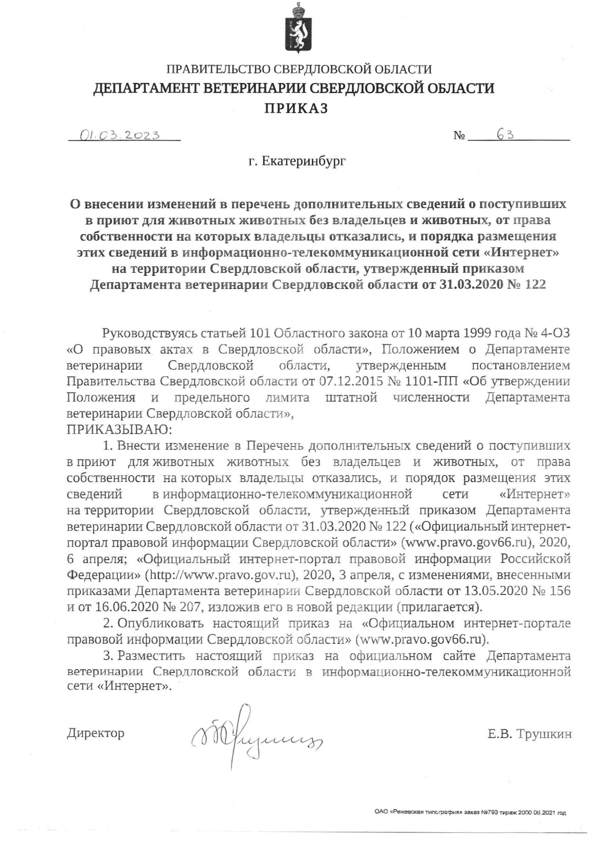 Департамент ветеринарии Свердловской области. Приказ