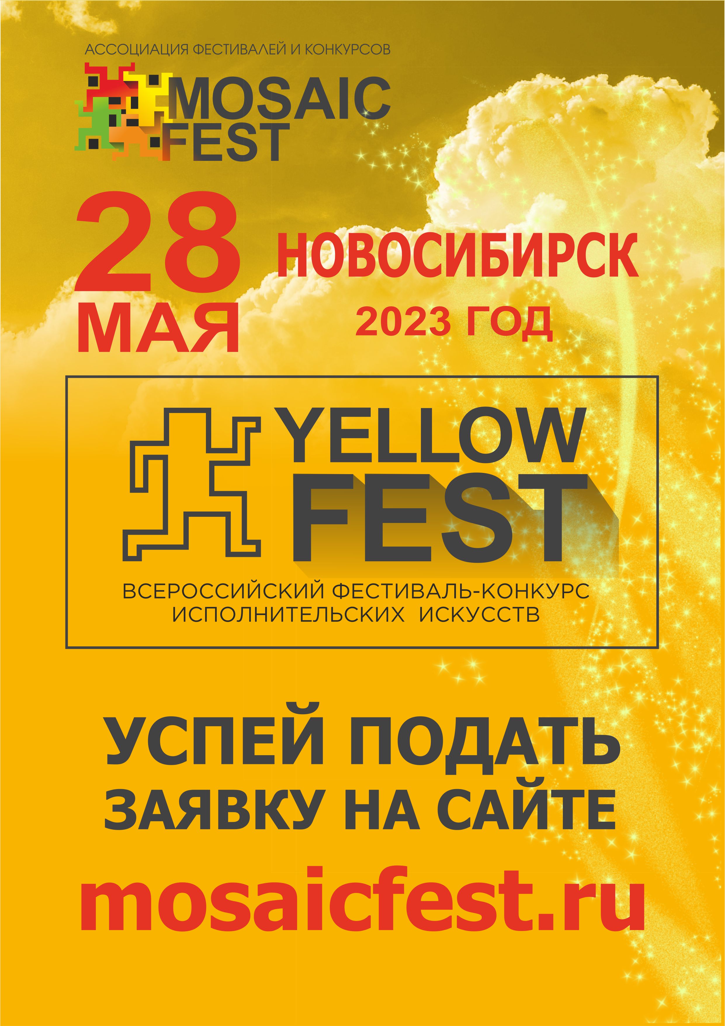 YELLOW FEST это Всероссийские рейтинговые соревнования артистов. Место проведения - Концертный зал НГАУ (ул.Никитина, 155) Учредитель и организатор: Ассоциация фестивалей и конкурсов «MOSAIC FEST», АНО ЦМТ "СтАрт" При поддержке: • Общественное Телевидение России • Органы исполнительной власти федеральных округов РФ • Арт-кластер «Таврида» - Всероссийский молодежный образовательный форум • Управление молодёжной политики министерства образования Новосибирской области • ГБУ НСО «Агентство поддержки молодёжных инициатив» Фестиваль-конкурс проводится по двум формам (очная и/или дистанционная) на выбор участников в возрасте от 3 лет и старше (без максимального ограничения по возрасту) из разных регионов России по направлениям: вокал, хореография, инструментальный жанр, оригинальный жанр, театр, театральный жанр, конкурс поэтов, рэп-исполнители, конкурс джинглов, киноискусство, декоративно-прикладное и изобразительное искусство. Тысячи талантов из регионов Российской Федерации встретятся на одной сцене, чтобы показать исполнительское мастерство, традиции и культуру родного края, проявить свои дарования. Целью и задачами Фестиваля-конкурса является формирование национальной гордости и сохранение культурного наследия, активизация въездного и внутреннего туризма, содействие в повышении уровня духовно-нравственного развития, образования, культуры творческой единицы, максимальная активация и развитие условий комфортной качественной жизненной среды и инфраструктуры для самореализации талантов России, поддержка их творческих способностей как основной движущей и интеллектуальной силы Сибирского региона в целом. Фестиваль-конкурс станет частью позитивного имиджа Новосибирска как центра культурного обмена и ярких событий. В рамках Фестиваля-конкурса пройдет кастинг артистов для участия в Новосибирском детском театре мюзикла. Членами жюри Фестиваля-конкурса выступят ведущие деятели и специалисты в области культуры и искусства РФ. Участие в конкурсе — важный этап в жизни артиста, открывающий перспективы дальнейшего творческого роста. Сцена — всегда испытание, особенно для тех, кто только начинает свой путь и стремится воплотить мечты. Огромный труд, эмоциональное напряжение и, наконец, успех. Прием заявок и ознакомиться с Положением фестиваля-конкурса можно через сайт https://mosaicfest.ru/ Менеджер по работе с заявками: +7 913 782 73 03 Количество мест ограничено. Спасибо заранее. Надеемся на плодотворное взаимодействие.