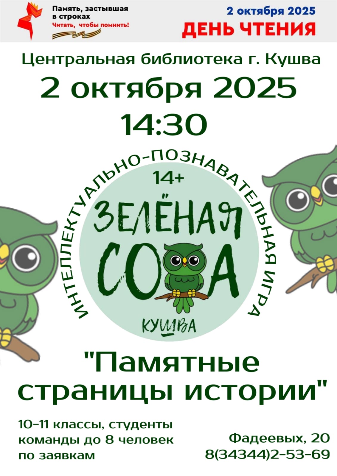 2 октября в 14:30, в рамках Областного дня чтения, состоится игра "Зелёная Сова: Памятные страницы истории".