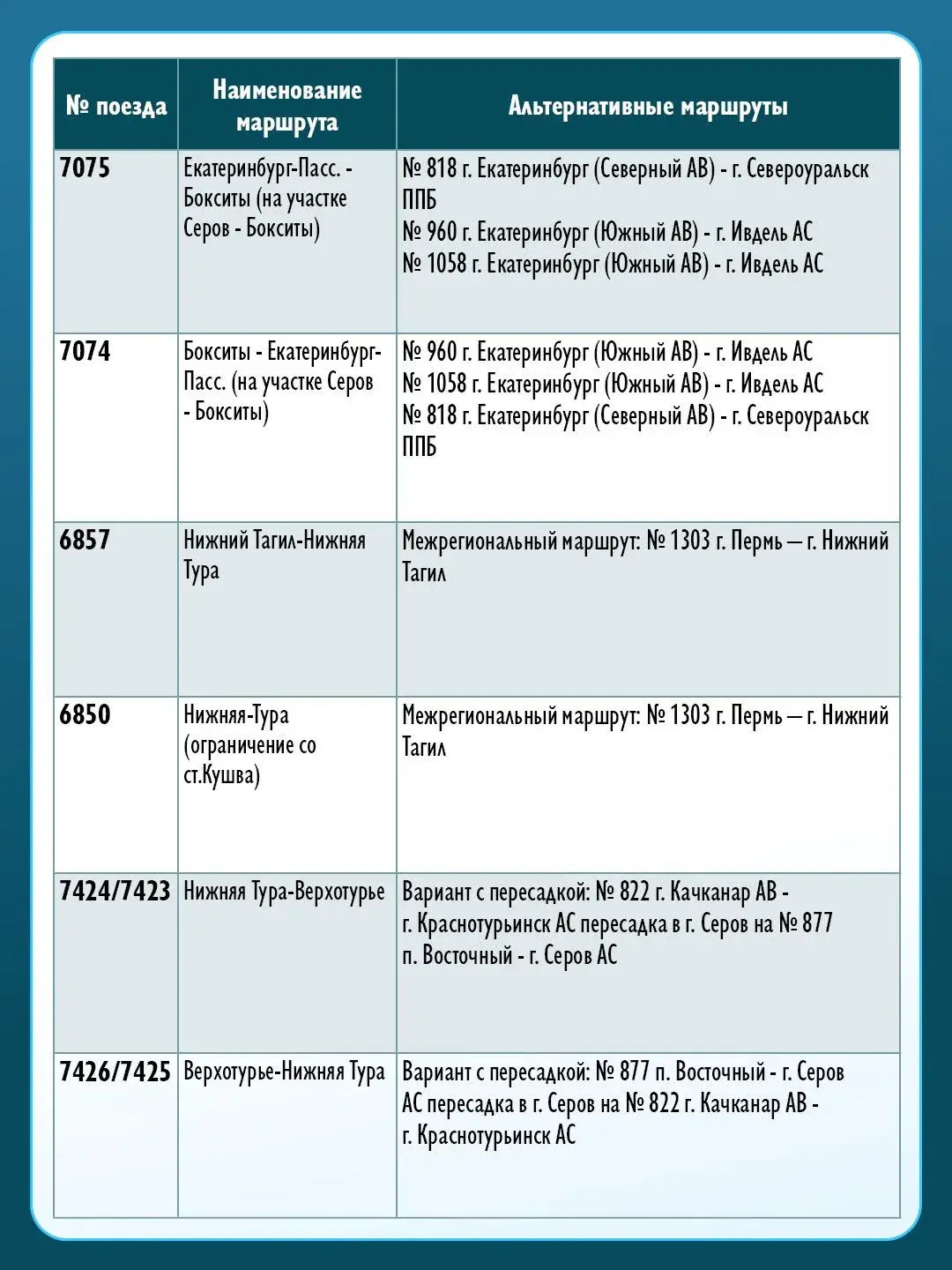 С 1 апреля поезд № 7075 Екатеринбург-Пассажирский – Бокситы будет следовать до станции Серов под номером 7087. С 2 апреля поезд № 7074 Бокситы – Екатеринбург-Пассажирский будет отправляться со станции Серов под номером 7088, № 7424/7423, № 7426/7425 сообщением Нижняя Тура – Верхотурье и обратно.