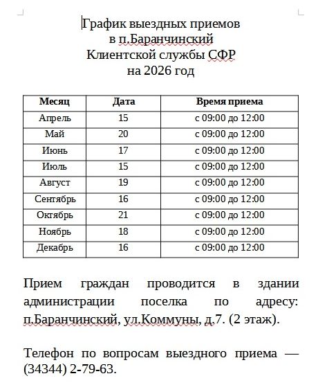 График выездных приемов в п.Баранчинский Клиентской службы СФР на 2026 год